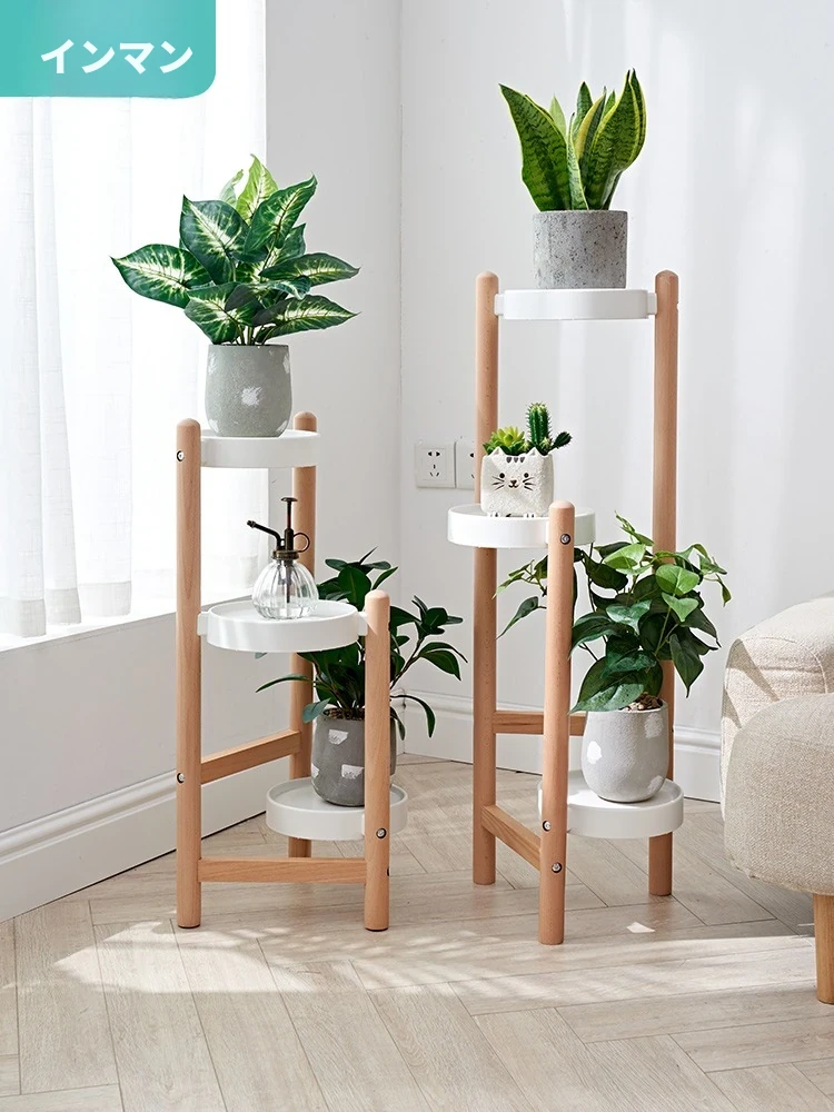 北欧スタイルの無垢材フラワースタンド - 室内用の多肉植物や観葉植物に最適!バルコニーやリビングにぴったりのクリエイティブな収納ラック。自然の温もりを感じるおしゃれなインテリアアイテム!