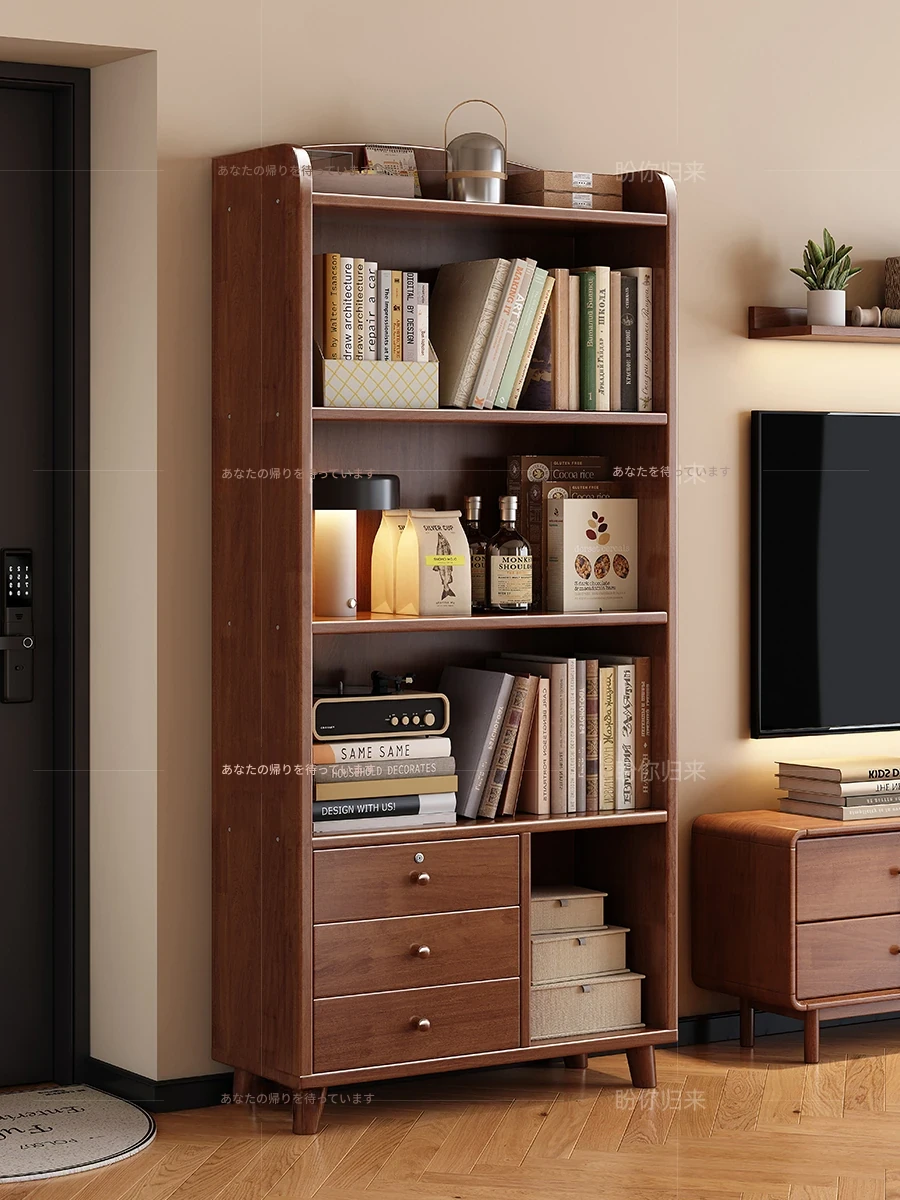 スタイリッシュな実木製書棚 - 引き出し付き収納キャビネット、リビングに最適な壁面収納!学生にもぴったりの収納力抜群の書庫です。整理整頓を楽しむ空間作りをサポートします!