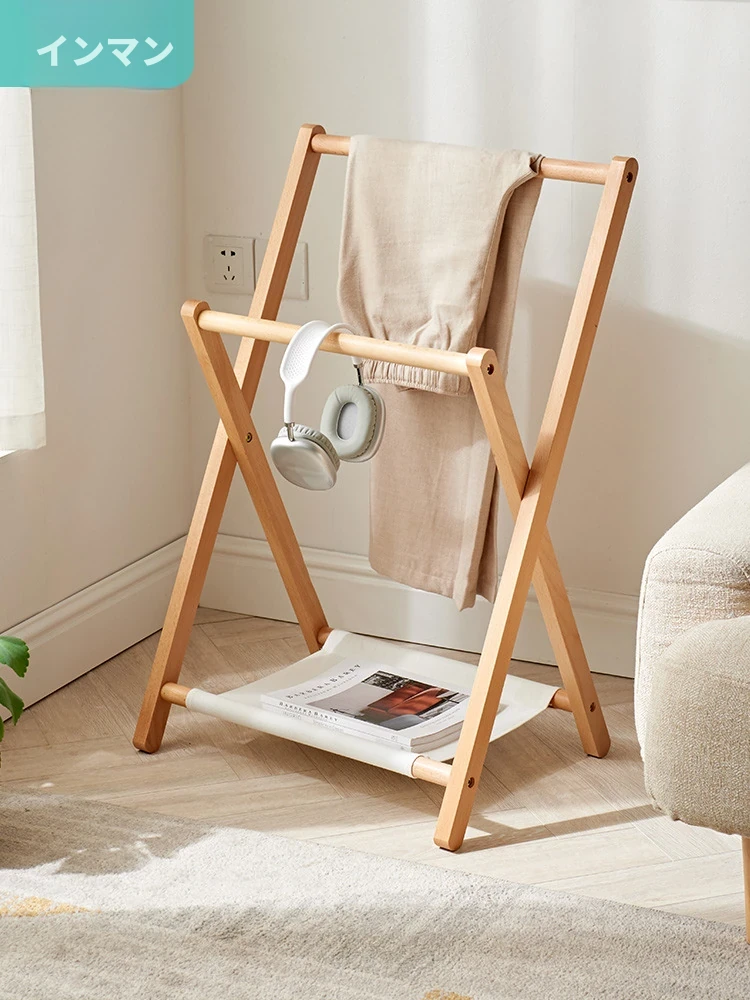 北欧スタイルの実木ベッドサイド衣類ラック - 夜の衣服をスッキリ収納!コンパクトなデザインで、寝室をおしゃれに演出。便利な一時的な衣類掛けとしても最適!