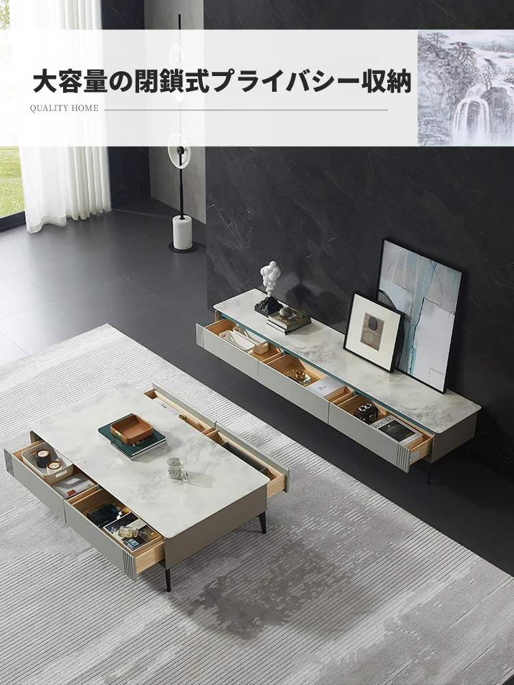 シンプルでスタイリッシュな左右対称の岩板製コーヒーテーブル&テレビキャビネットセット - 現代的な軽奢スタイルのリビングにぴったり!小さなお部屋にも最適なDCJ7005Aモデル。