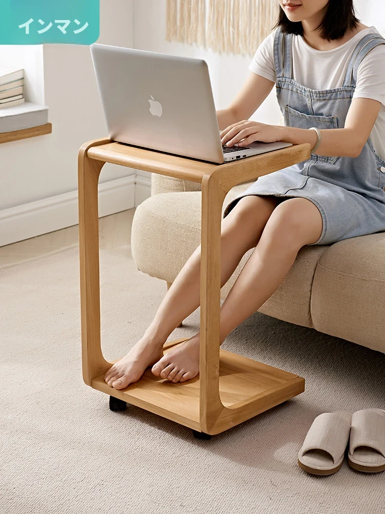 キャスター付きの無垢材ソファサイドテーブル - 小スペースに最適な移動可能なティーテーブル!リビングやベッドサイドにピッタリな、おしゃれで実用的なインテリアアイテムです。