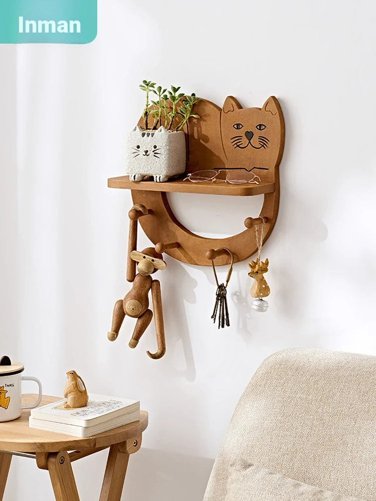 Inman Creative Solid Wood Wall-Mounted Coat Rack - Multifunctional Storage Shelf with Cute Cat Design for Nordic Children's Room, Perfect for Organizing and Displaying!
