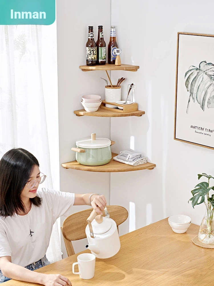 Inman Solid Wood Corner Shelf - Minimalist Fan-Shaped White Wall Storage Rack, Natural Wood Flower Stand, Japanese Style Corner Shelf