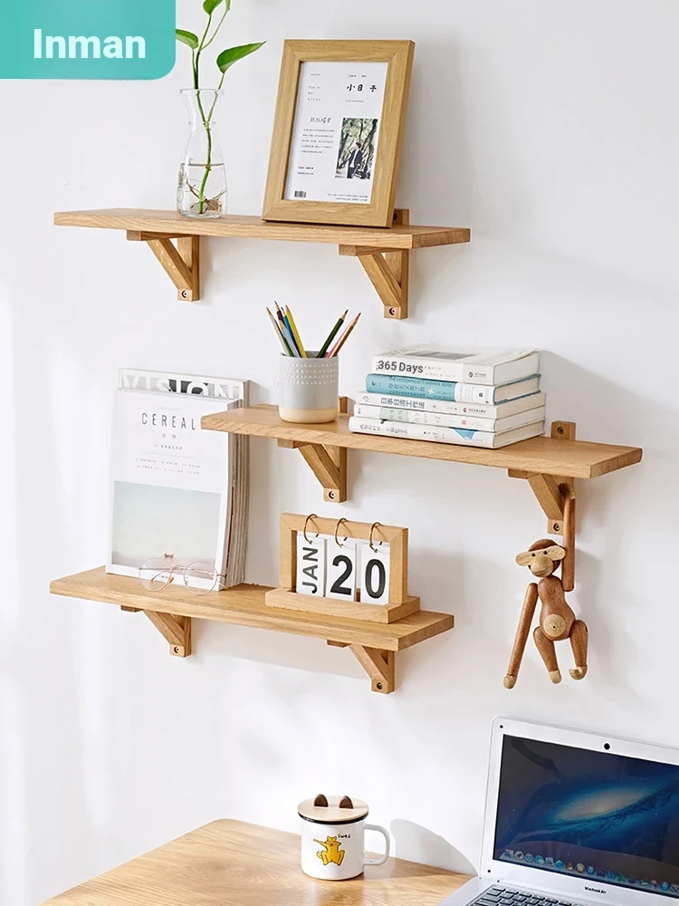 Inman Solid Wood Wall-Mounted Shelf - Triangle Bracket for Bedroom, Oak Wall Storage Rack, Stylish Wall-Mounted Bookshelf for Living Room and Home Decor