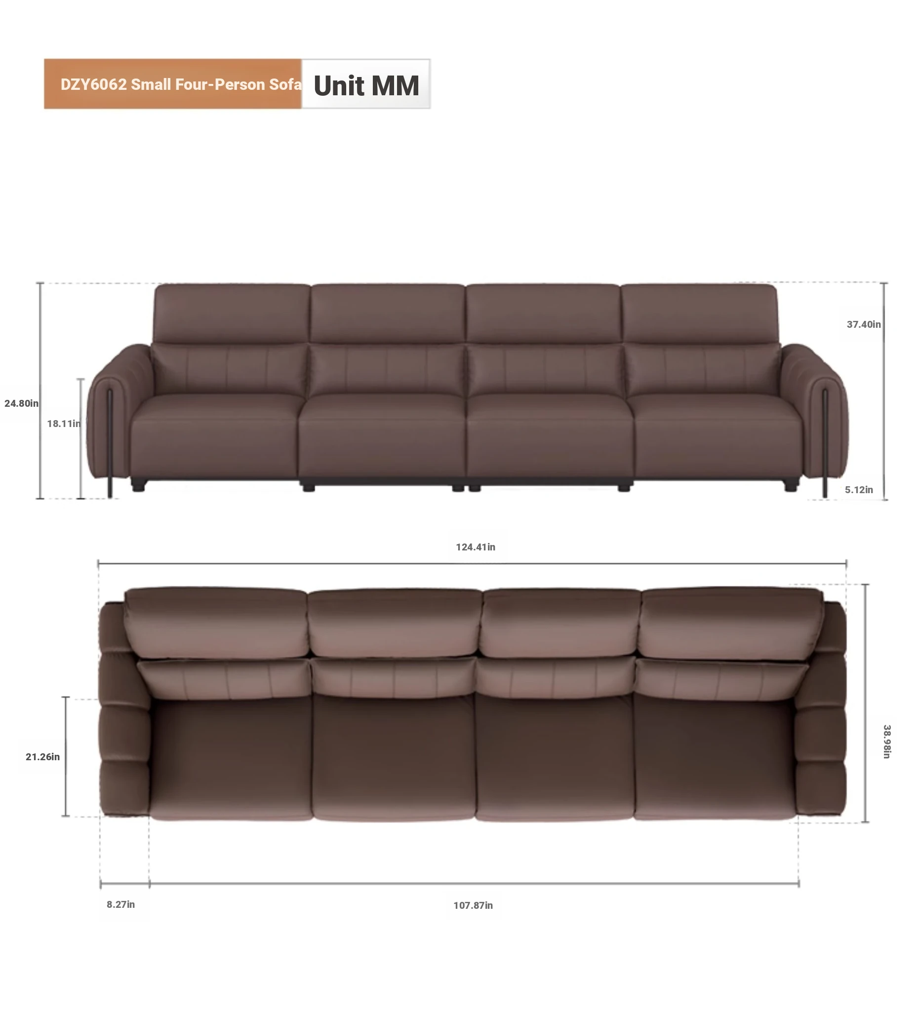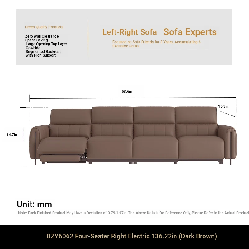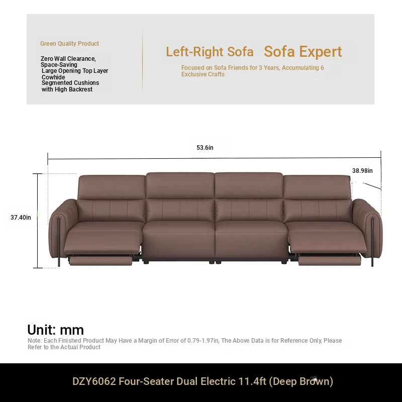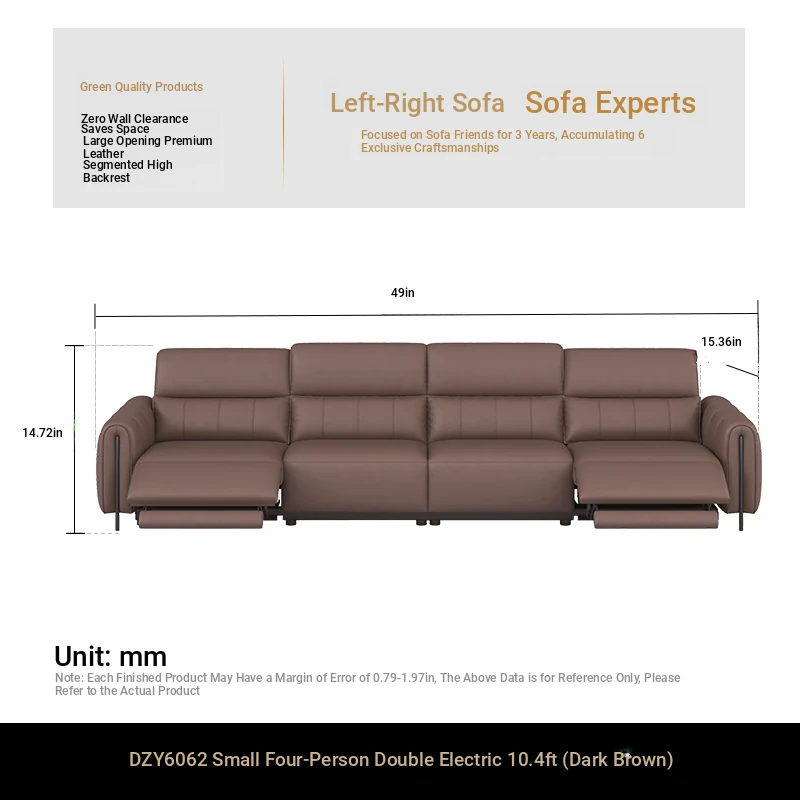 ⑦【Zero Against the Wall】 124.41in Small Four-Seater Double Electric Dark Brown Color