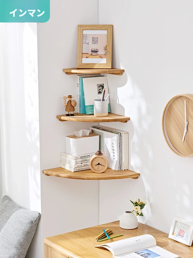 インマン 無垢材のコーナー収納ラック 家庭用三角スタンド 壁掛け本棚 オーク材のデスク上収納 隅にピッタリの整理整頓アイテム!おしゃれで実用的な収納ソリューションをお見逃しなく!