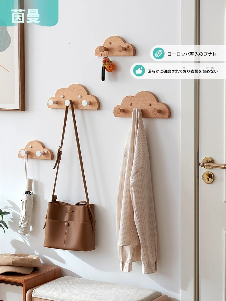 穴あけ不要!おしゃれな天然木製キッズコートハンガー。ベッドルームや玄関にぴったりのブナ製雲型フック。お子様の服や帽子を可愛く収納して、お部屋をスッキリ整理!
