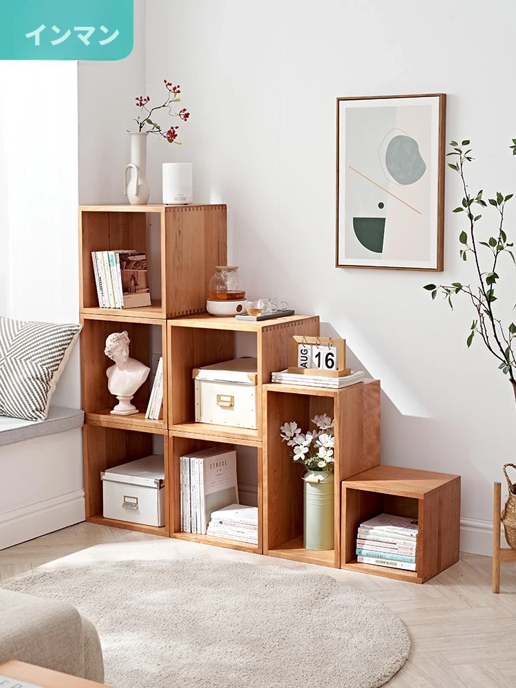 インマン無垢材の組み合わせ自由収納ラック - ウォールナットとチェリーウッドの美しいデザイン、動かせる収納スペースで、あなたのインテリアをスタイリッシュに演出する和風本棚!