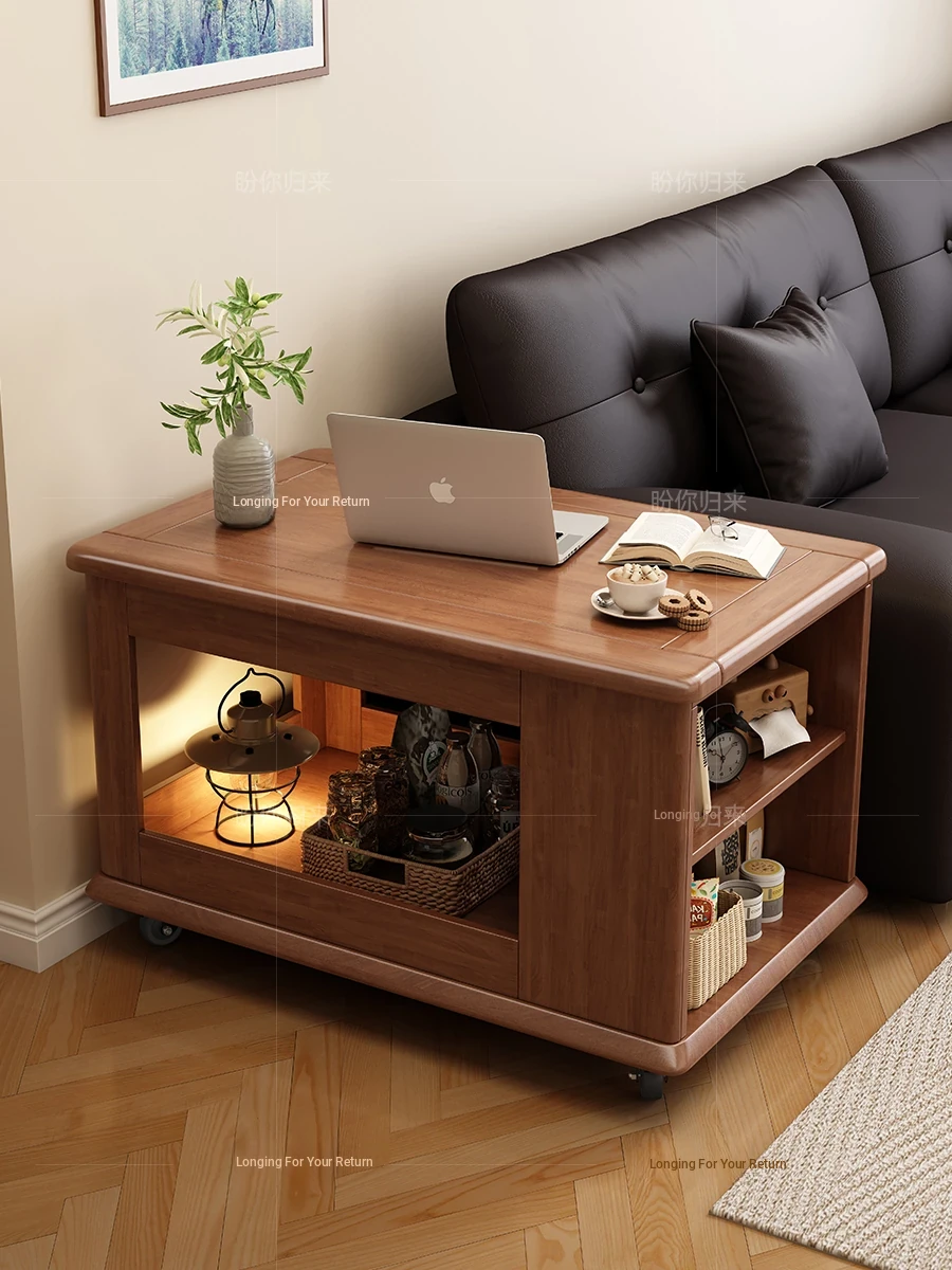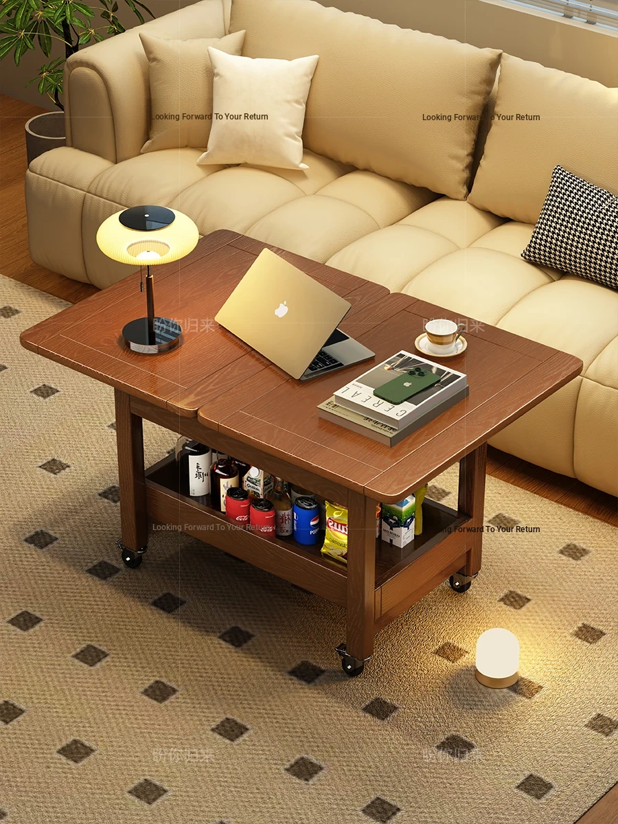 Solid Wood Folding Coffee Table - Multi-Functional Small Sofa Side Table for Living Room, Compact Design for Small Spaces, Versatile Rolling Cart & Side Cabinet